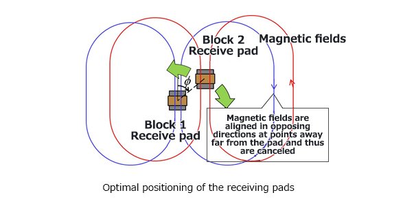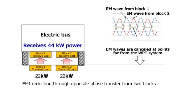 Suppressing radiated waves is thus an important requirement to realize wireless charging systems for electric buses. Toshiba’s technology achieves this by employing two discrete 22-kW blocks that transfer power in opposite phases, cancelling EM waves from each other and reducing undesirable EM waves.