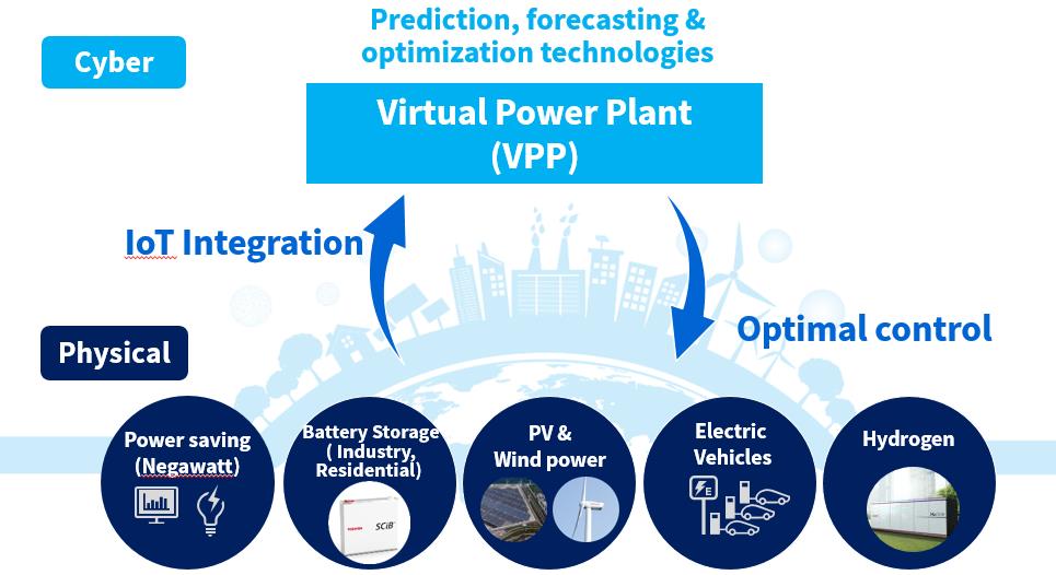 Saito: At Toshiba we can point at many things we are working on at the technology level. One is the virtual power plant (VPP). Here we are using IoT to coordinate distributed power sources, such as solar, wind power and hydrogen power generation sites, electric cars and rechargeable batteries, and to coordinate their operation as if they were a single power plant. By utilizing IoT in areas such as power saving and nega-watt transactions, and conducting AI-based analysis and power demand prediction, we are also working with customers to construct mechanisms for controlling distributed power sources and equipment on the customer side and optimizing power supply.