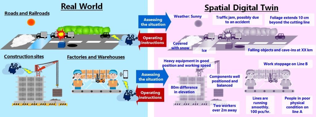 Beyond equipment digital twins that model specific processes, there is now an emerging need for spatial digital twins—the capability to reproduce entire factories or urban areas (Fig.1). Creating these advanced digital twins will support the automation of all kinds of mobility equipment, and the overall optimization of factories and logistics warehouses. In cities, they will mitigate problems like those caused by accidents and traffic congestion (Fig.2).