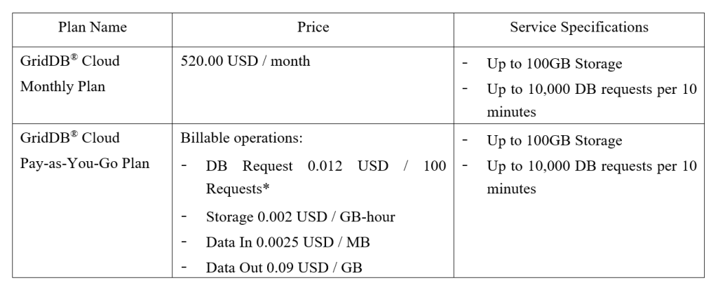 *Until the end of September 2025, all ‘DB request’ on the GridDB® Cloud Pay-as-You-Go Plan will be completely free.